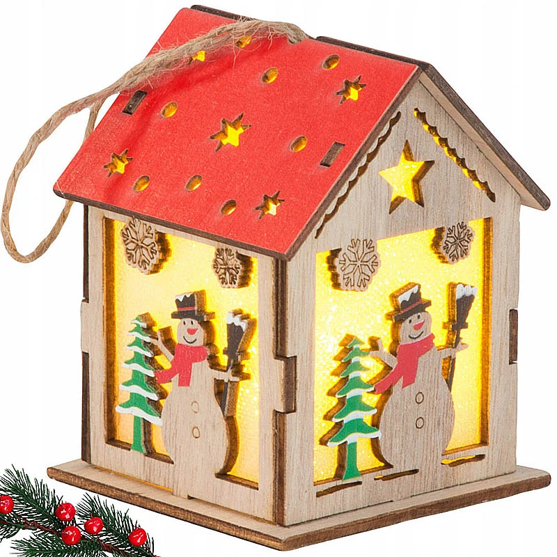 Lampáš je vyrobený z prírodného dreva a zdobený detailmi s motívom snehuliaka a stromčeka. Je ľahký, takže ho môžete bez problémov zavesiť na vianočný stromček, ale rovnako dobre poslúži aj ako dekorácia na stole, komode, okne či v kombinácii s girlandou.