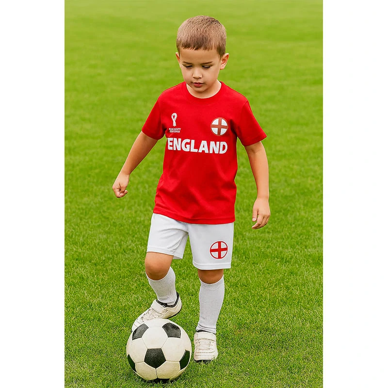 Štýlová a pohodlná detská súprava inšpirovaná anglickýmm národným tímom je ideálna pre všetkých malých fanúšikov futbalu. Skladá sa z červeného dresu a bielych kraťasov, ktoré sú doplnené o oficiálne motívy a nápis ENGLAND.