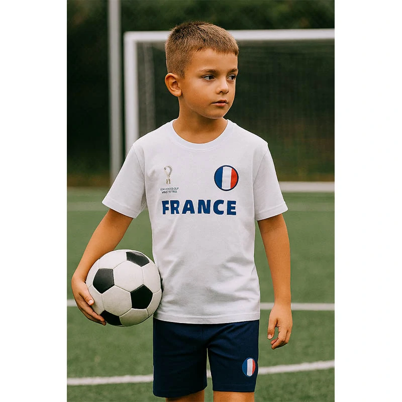 Štýlová a pohodlná detská súprava inšpirovaná francúzskym národným tímom je ideálna pre všetkých malých fanúšikov futbalu. Skladá sa z bieleho dresu a tmavomodrých kraťasov, ktoré sú doplnené o oficiálne motívy a nápis FRANCE.