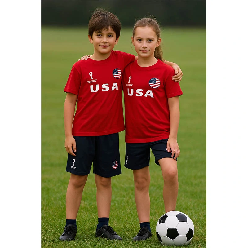 Štýlová a pohodlná detská súprava inšpirovaná americkým národným tímom je ideálna pre všetkých malých fanúšikov futbalu. Skladá sa z červeného dresu a modrých kraťasov, ktoré sú doplnené o oficiálne motívy a nápis USA.