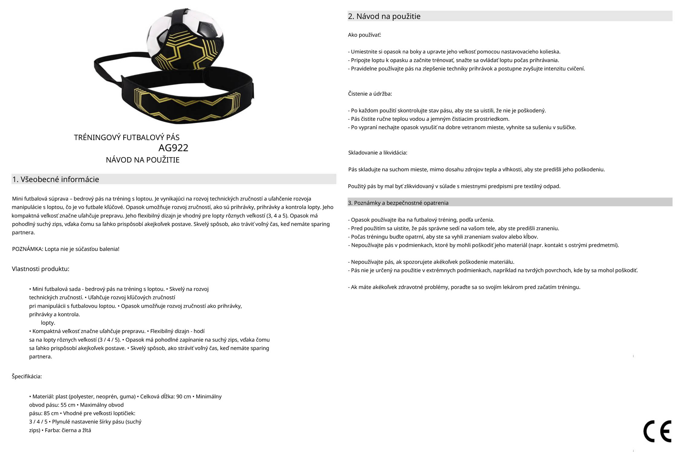Opasok je vybavený nastaviteľným suchým zipsom, vďaka ktorému sa pohodlne prispôsobí rôznym postavám. Univerzálna konštrukcia pasuje na lopty veľkostí 3, 4 a 5, takže je vhodný pre deti aj dospelých. Ľahký a kompaktný dizajn umožňuje jednoduché prenášanie a tréning kdekoľvek – na ihrisku, v záhrade alebo na dovolenke.