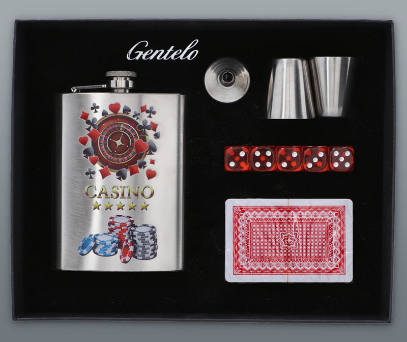 - Gentelo Darčeková sada Casino s ploskačkou, pohárikmi, lievikom, hracími kartami a kockami