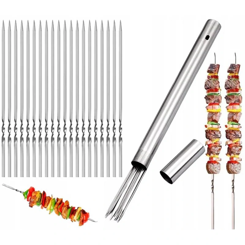 Táto súprava 20 opakovane použiteľných špajdlí z nehrdzavejúcej ocele je ideálnym pomocníkom pre každého milovníka grilovania. Vďaka ostrým hrotom, dekoratívne skrútenému telu a praktickému kovovému puzdru pripravíte lahodné špízy z mäsa, zeleniny, ovocia alebo tofu bezpečne a štýlovo – doma, na chate, aj pri táboráku.