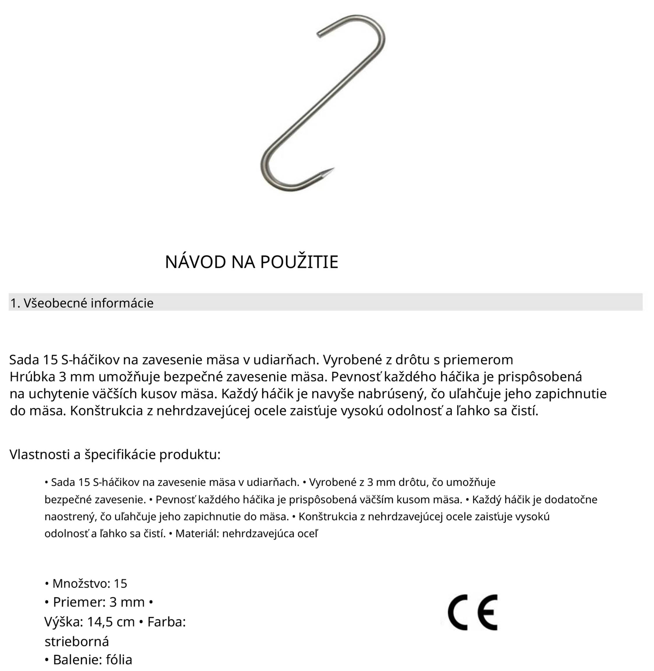 Táto sada obsahuje 15 pevných hákov typu „S“, ktoré sú ideálne na zavesenie mäsa v domácej údiarni. Vďaka hrúbke drôtu 3 mm sú háky dostatočne silné na uchytenie aj väčších kusov mäsa, pričom ich zaostrený koniec zabezpečuje ľahké a bezpečné napichnutie.