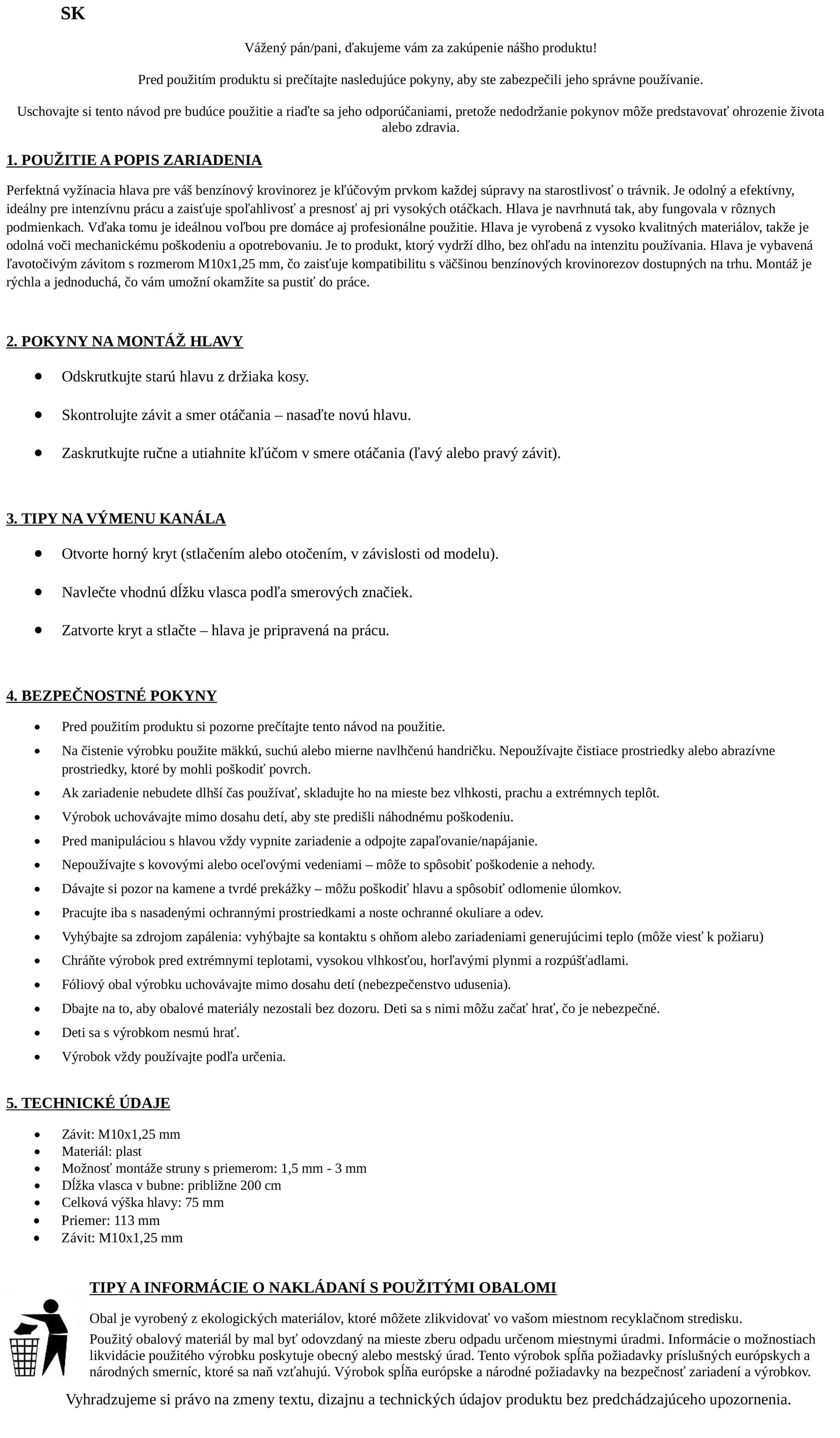 Táto hlavica má ľavotočivý závit M10 × 1,25 mm, vďaka čomu pasuje na väčšinu bežných benzínových krovinorezov dostupných na trhu. Pred kúpou si však odporúčame skontrolovať špecifikáciu svojho zariadenia.