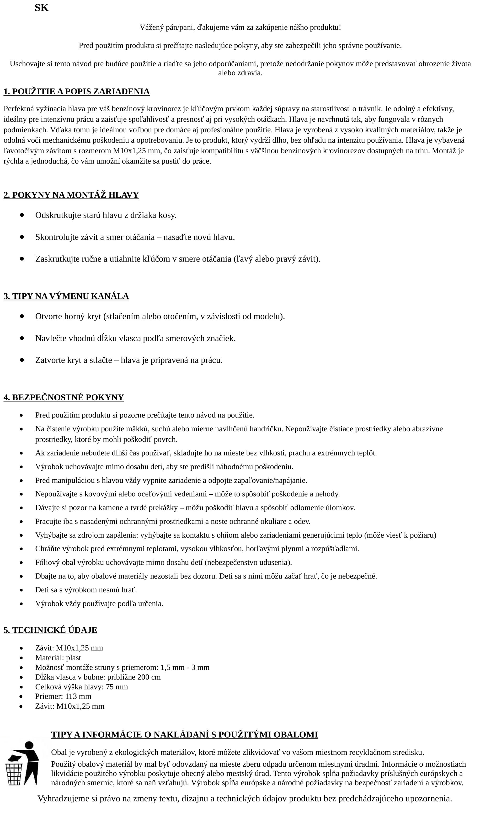 Vďaka závitu M10 × 1,25 mm (ľavý) sa táto hlavica hodí na väčšinu štandardných benzínových krovinorezov. Jednoducho ju naskrutkuješ a môžeš sa pustiť do práce.