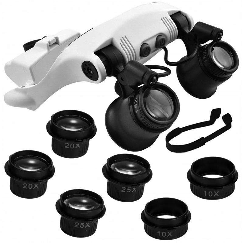 Hodinárska lupa - okuliare 2LED s vymeniteľnými šošovkami 10-25x