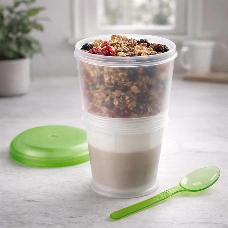 Spodná časť je určená na mlieko, jogurt alebo iný nápoj. Horná časť slúži na müsli, ovocie, orechy či kukuričné lupienky. Tento doplnok zabraňuje rozmočeniu vločiek a umožňuje vrstviť suroviny presne podľa vašej chuti.