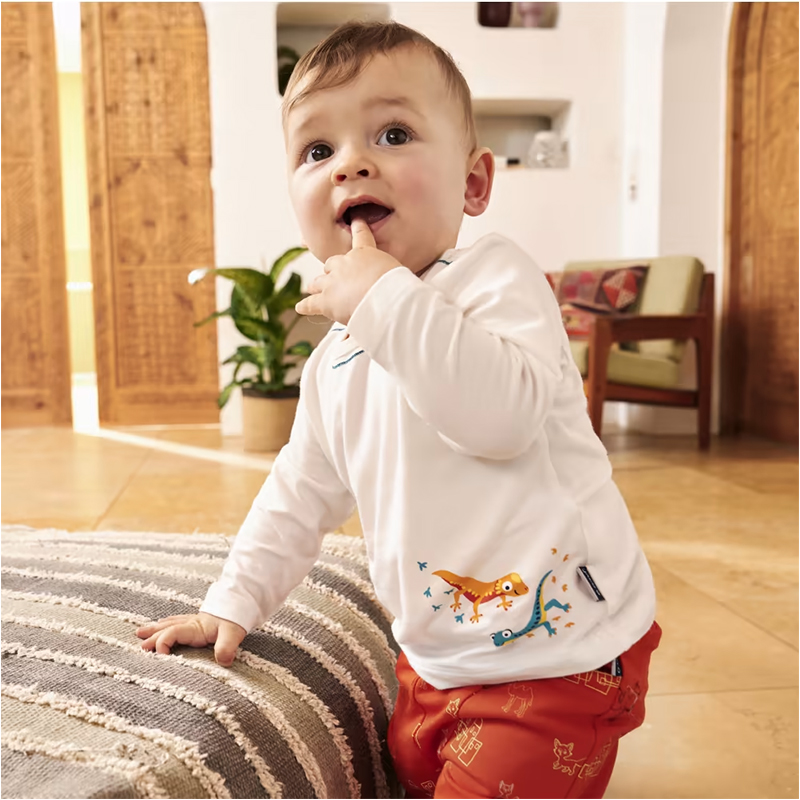 Mäkký, splývavý bambusový viskózový materiál detskej košieľky s dlhým rukávom je nielen príjemný na pokožke, ale má aj termoregulačné vlastnosti - čo je obzvlášť príjemné v lete. A špeciálny výstrih s gombíkmi na pleciach na oboch stranách výrazne spríjemní únavné preťahovanie cez hlavu.