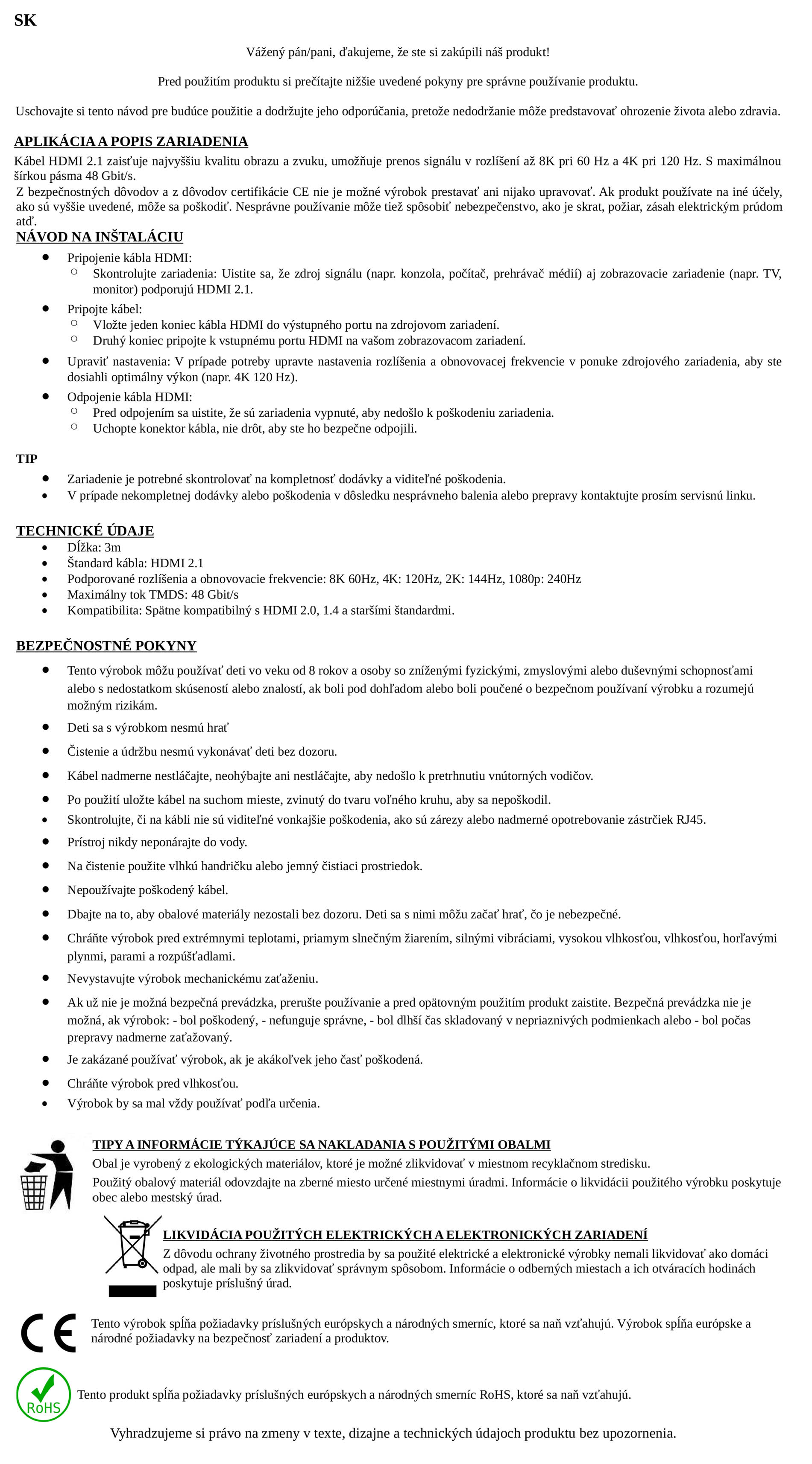 Tento HDMI kábel je navrhnutý pre náročných používateľov, ktorí očakávajú maximálnu kvalitu obrazu aj zvuku. S podporou rozlíšenia 8K pri 60 Hz a 4K pri 120 Hz je ideálny pre moderné televízory, herné konzoly, projektory, monitory a audio-video zostavy.