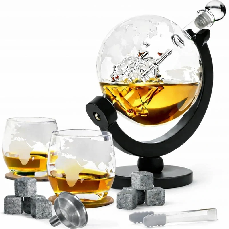 Karafa v tvare glóbusu s dvoma pohármi je určená na štýlové servírovanie whisky a iných destilátov. Spojenie funkčnosti a výrazného dizajnu z nej robí nielen praktický doplnok domáceho baru, ale aj výrazný dekoratívny prvok. Vnútorná dekorácia v podobe plachetnice a drevený stojan podčiarkujú cestovateľský a zberateľský charakter celého setu.