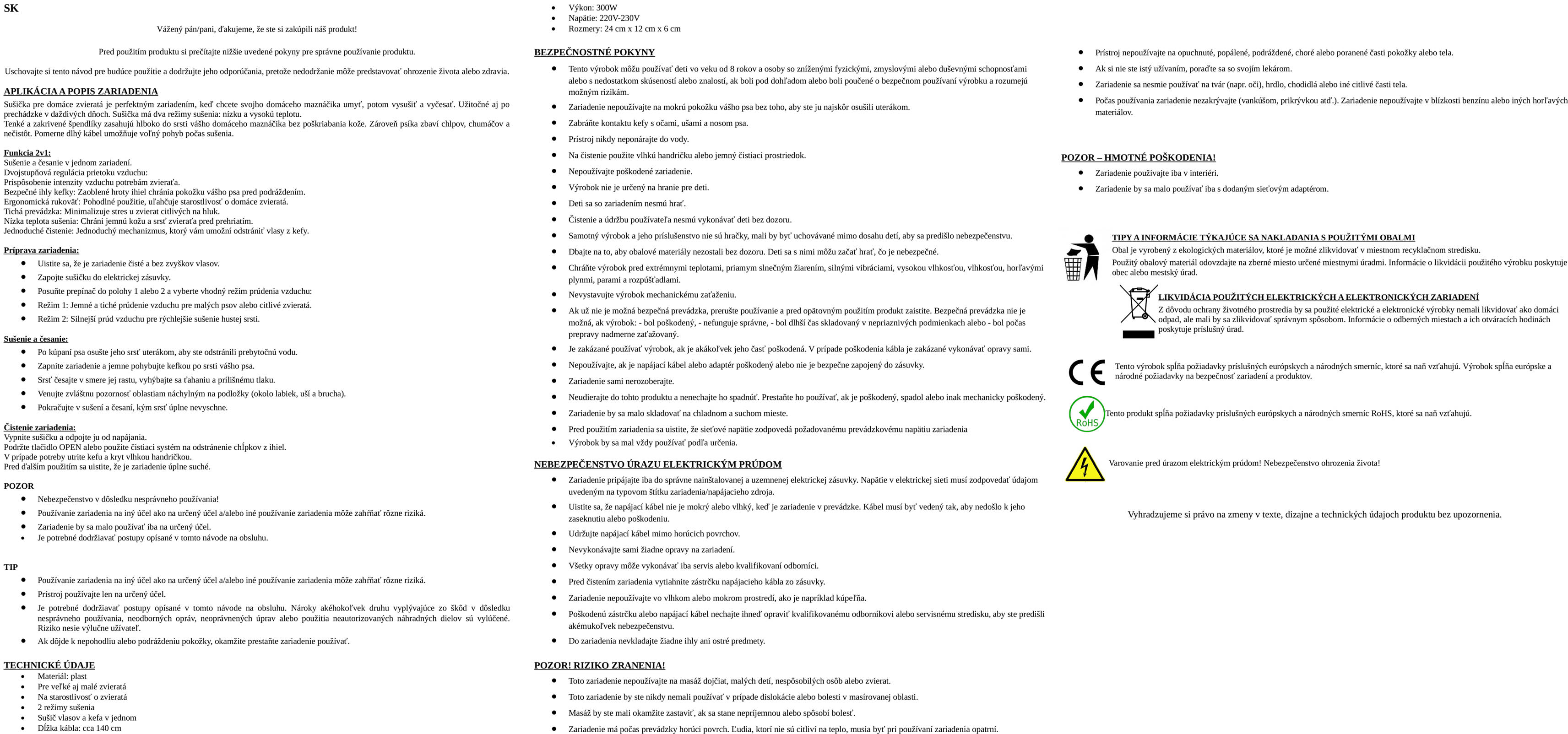 Sušič pre domáce zvieratá je perfektným zariadením, keď chcete svojho domáceho maznáčika umyť, potom vysušiť a vyčesať. Užitočné aj po prechádzke v daždivých dňoch. Sušič má dva režimy sušenia: nízku a vysokú teplotu.