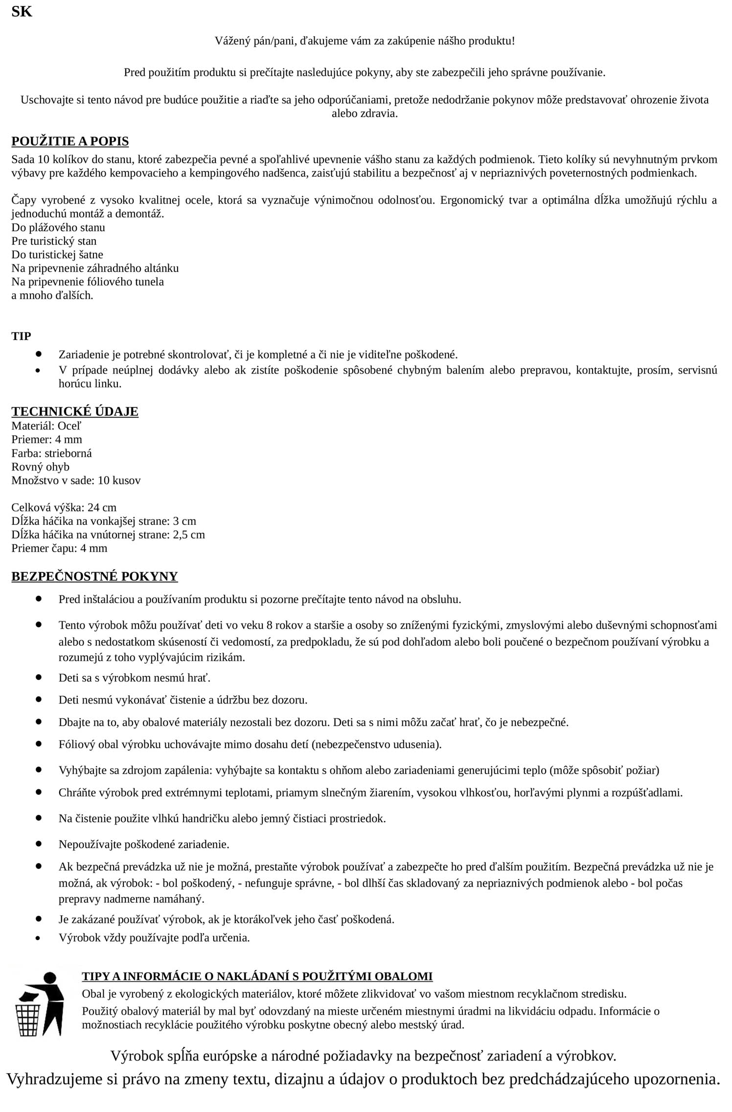 Kolíky majú praktický tvar so zahnutými koncami, čo umožňuje jednoduché a bezpečné uchytenie látky alebo povrazu. Sú vhodné nielen na stany, ale aj na plážové prístrešky, záhradné altánky, turistické prezliekarne či fóliovníky.