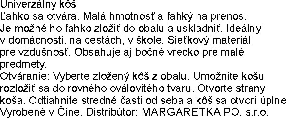 Priestranný a samorozkladajúci sa sieťovaný kôš, hodiaci sa na ukladanie posteľnej bielizne, ako aj hračiek. V zloženom stave zaberá málo miesta. Ľahko sa čistí, a prišité rúčky uľahčujú jeho prenos. Vrecko umiestnené v hornej časti koša je ideálne miesto na odkladanie kolíkov na pranie alebo na iné drobných a potrebných predmetov.