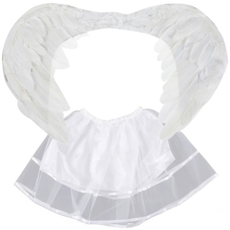 Anjelský kostým pozostáva z dvojvrstvovej sukne s gumičkou a bielymi krídlami pripomínajúcimi anjelské krídla. Biele pierka použité na výrobu krídel sú kvalitné, veľmi jemné a zamatové na dotyk. Aby sukňa vyzerala krásne, oblečte si pod ňu biele legíny alebo pančuchy.