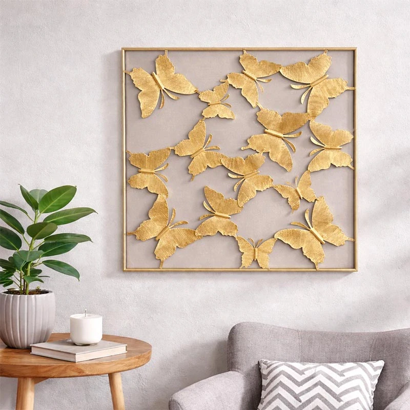 Ak hľadáte výraznú, no vkusnú nástennú dekoráciu, tento kovový obraz s motýľmi v zlatej mosadznej farbe je ideálnou voľbou do každého moderného interiéru. Objednajte si ho ešte dnes a oživte svoj domov štýlovým detailom.