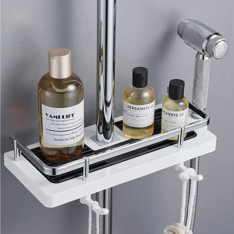 Pohodlná, kompaktná polica na montáž na sprchovú tyč.