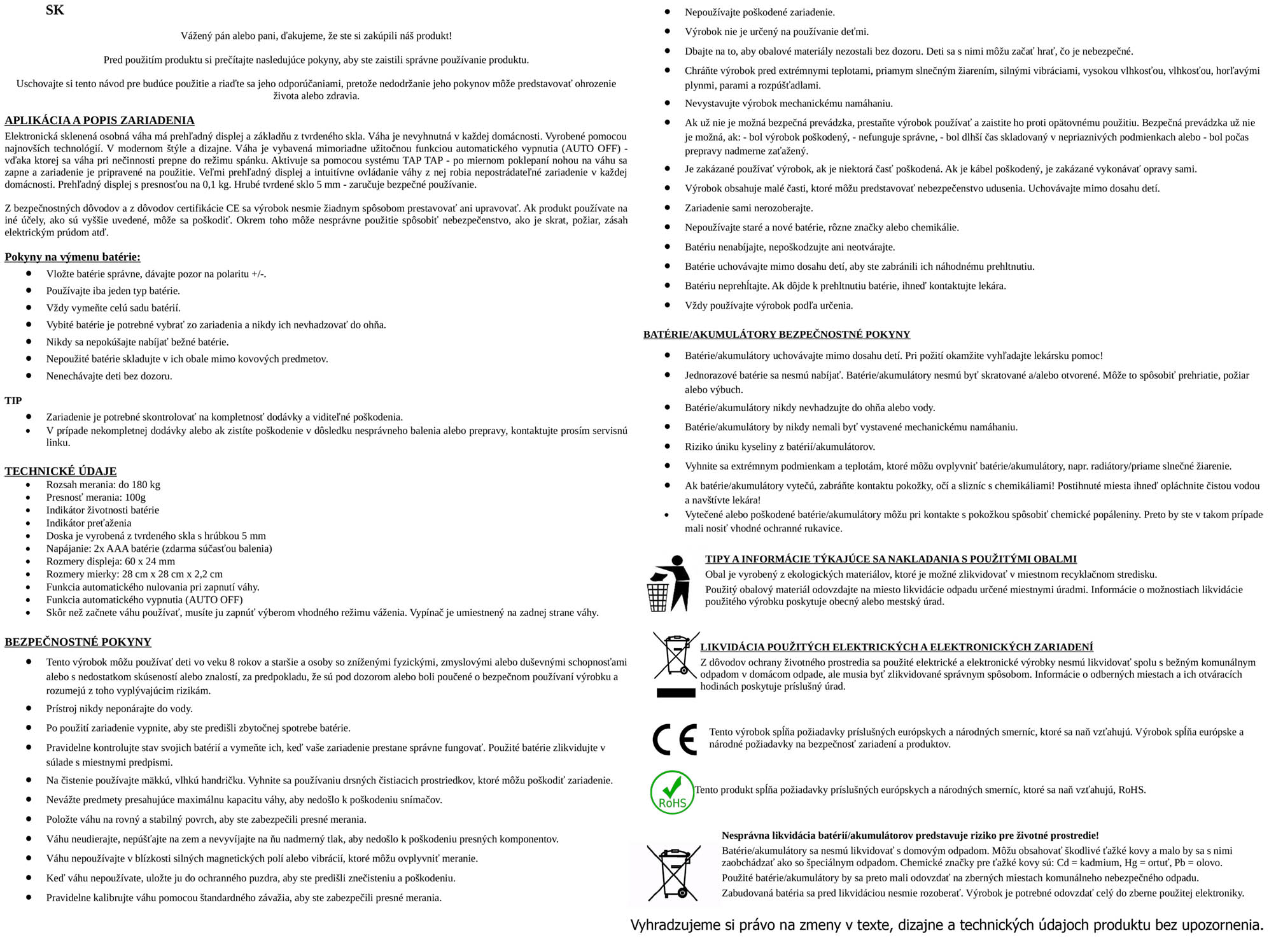Automatické funkcie – váha sa zapne poklepaním (TAP TAP systém), sama sa vynuluje a po chvíli nečinnosti vypne.