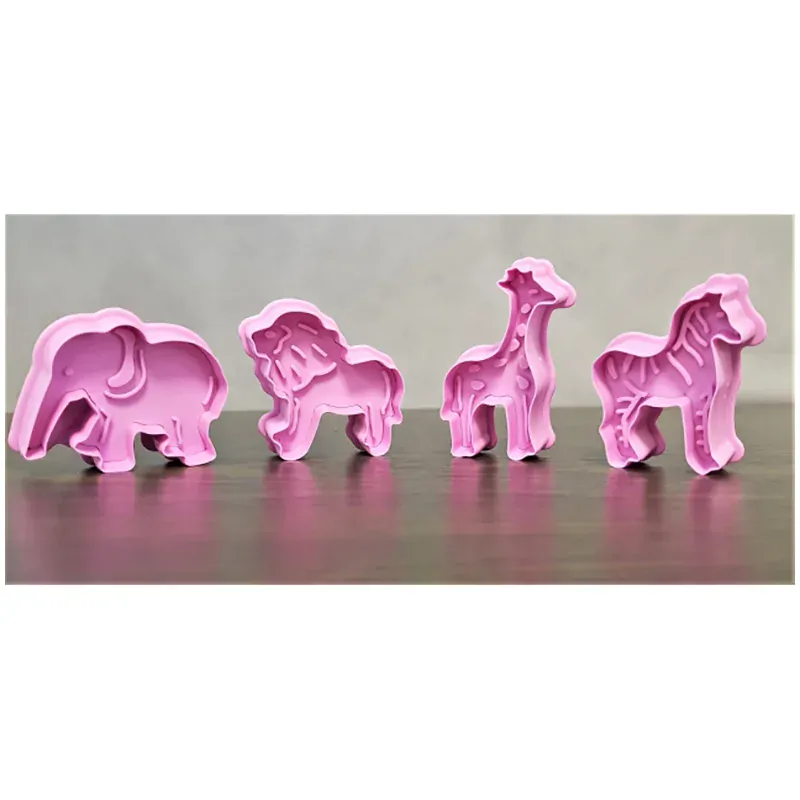 Cukrársky štvordielny set vykrajovačov s piestom / vypichovačky na marcipán cesto / s motívom Africkej fauny ( sloník, žirafa, lev a zebra ). Vhodné pre výrobu cukrárskych ozdôbok pre téematické dotvorenie cukroviniek.