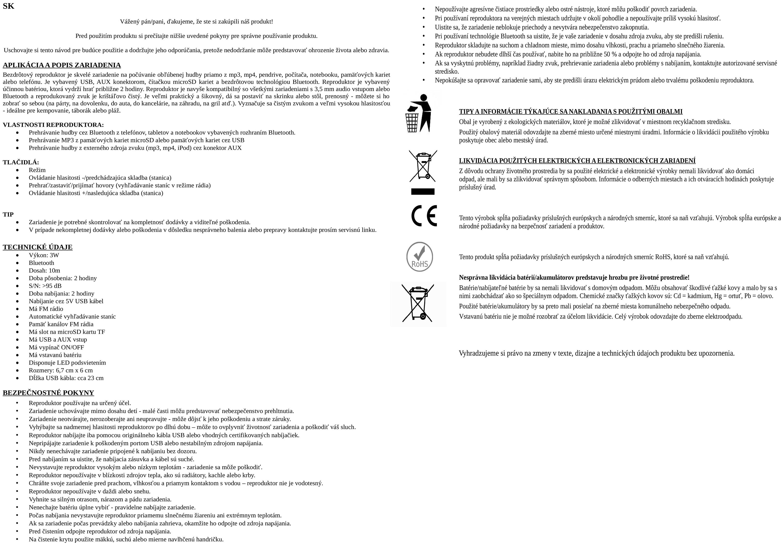 Reproduktor je vybavený účinnou batériou, ktorá vydrží hrať približne 2 hodiny. Reproduktor je navyše kompatibilný so všetkými zariadeniami s 3,5 mm audio vstupom alebo Bluetooth a reprodukovaný zvuk je krištáľovo čistý.