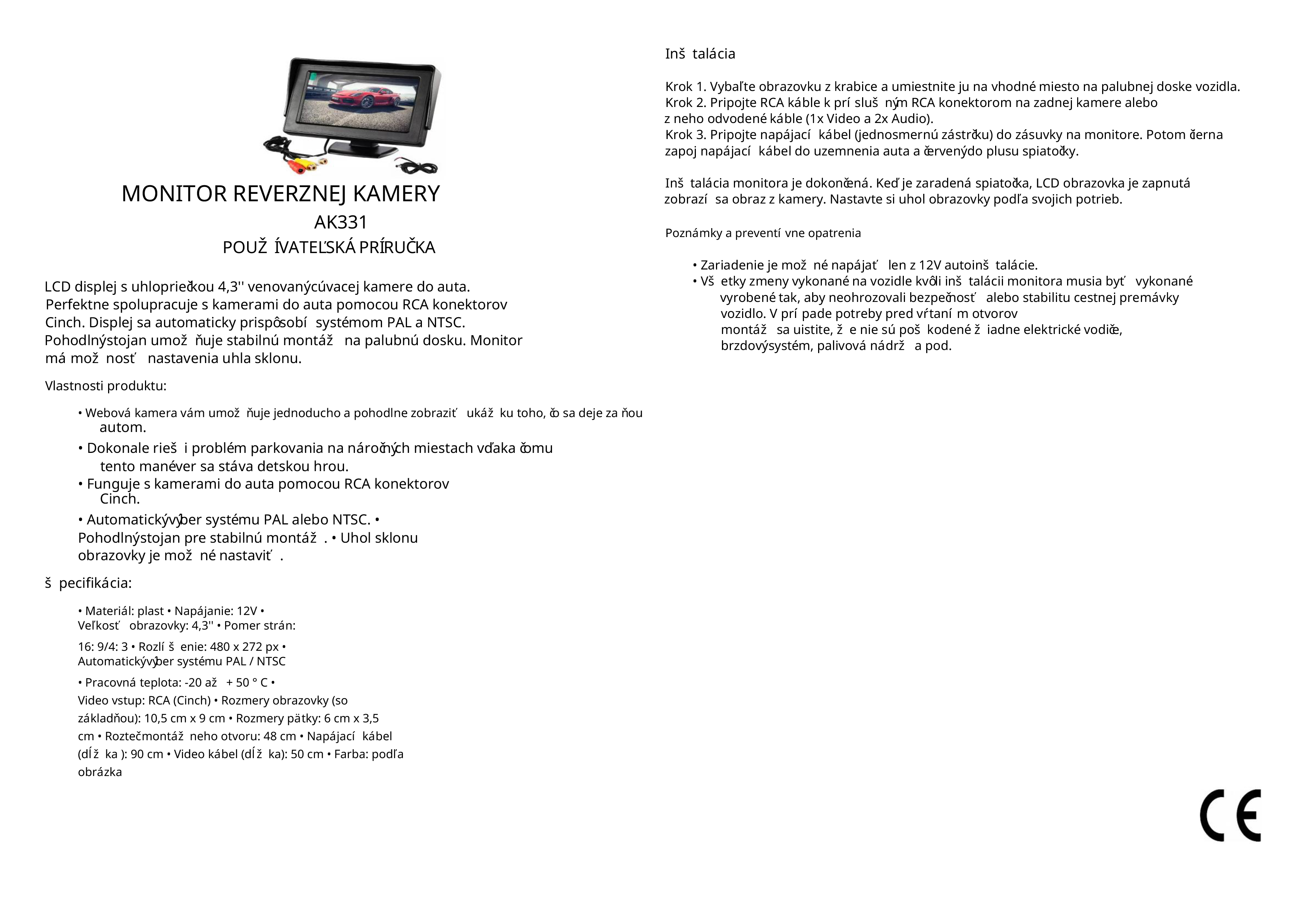 LCD displej s uhlopriečkou 4,3'' k cúvacej kamere do auta. Perfektne spolupracuje s kamerami do auta pomocou konektorov RCA Cinch. Displej sa automaticky prispôsobí systémom PAL a NTSC. Pohodlný stojan umožňuje stabilnú montáž na palubnú dosku. Monitor má možnosť nastavenia uhla sklonu.