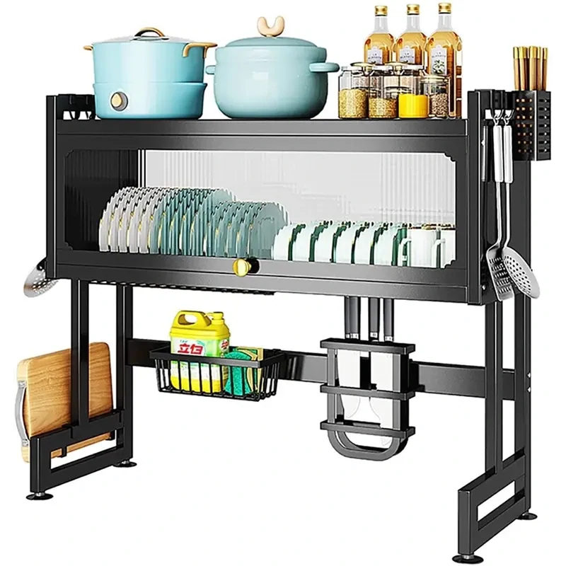 Robustná kovová konštrukcia s čiernou práškovou povrchovou úpravou je odolná proti korózii a dodáva výrobku elegantný vzhľad. Súčasťou je aj ochranná výklopná zástena, ktorá chráni riad pred prachom a zadržiava kvapky vody.