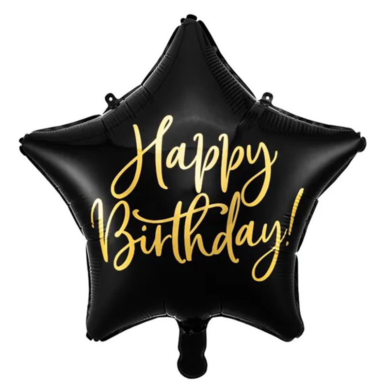 Lesklý fóliový balón v tvare hviezdy čiernej farby s nápisom "Happy Birthday" v zlatej farbe. Všetky narodeninové dekorácie v kompozícii s týmto balónom budú výnimočne krásne! Na nafúknutie vzduchom a héliom. Nafúknutá veľkosť: 40 cm.