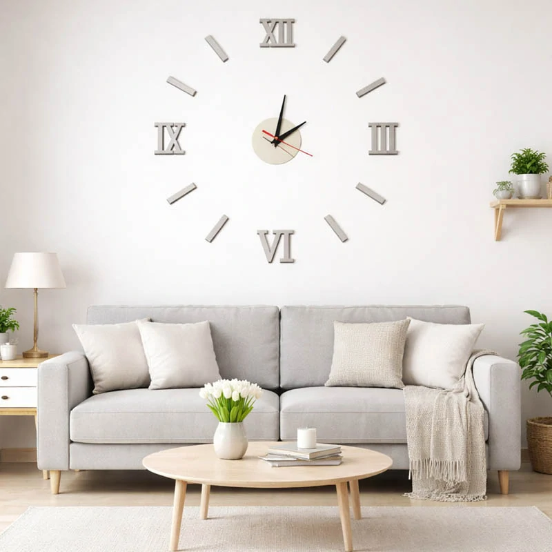 Tieto veľké nástenné hodiny sú určené na samostatnú montáž a slúžia nielen ako praktický ukazovateľ času, ale aj ako výrazný dizajnový prvok. Vďaka samolepiacim čísliciam a nastaviteľnému rozloženiu si môžete veľkosť hodín prispôsobiť presne podľa priestoru – od kompaktného vzhľadu až po dominantnú dekoráciu steny. Strieborné rímske číslice dodávajú interiéru elegantný a nadčasový charakter.