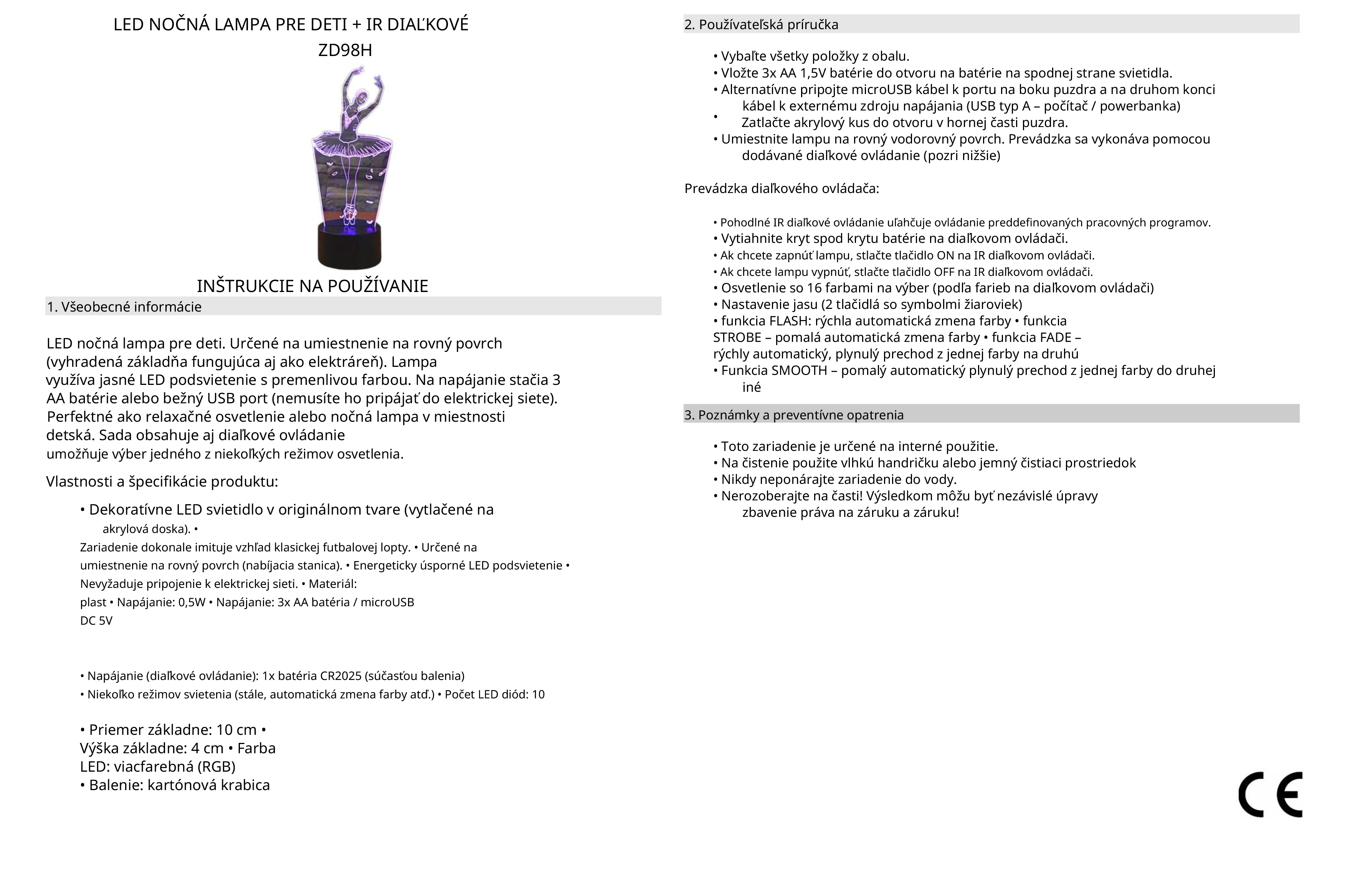 LED nočná lampa v tvare baletky (vytlačené na akrylovej doske). Navrhnuté na umiestnenie na rovný povrch (vyhradená základňa funguje aj ako elektráreň). Svietidlo využíva jasné LED podsvietenie s variabilnou farbou. Napájaná je 3 AA batériami alebo bežným USB portom (nemusíte ju pripájať do elektrickej siete). Perfektné ako relaxačné osvetlenie alebo nočná lampa v detskej izbe. Sada obsahuje aj diaľkové ovládanie, ktoré umožňuje zvoliť jeden z niekoľkých režimov svietenia.
