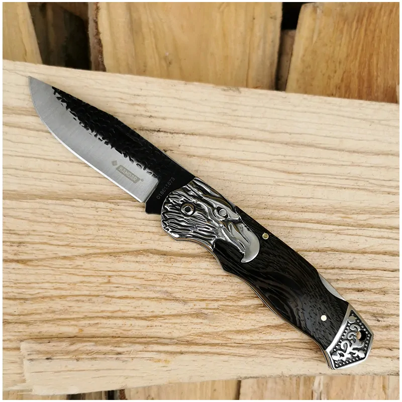 Rukoväť zaručuje bezpečné a pohodlné uchopenie. Jeho oceľový rám, na strane čepele dodatočne vystužený oceľovými podperami zdobenými 3D gravírovaním, a črienky rukoväte sú z exotického tmavého dreva.