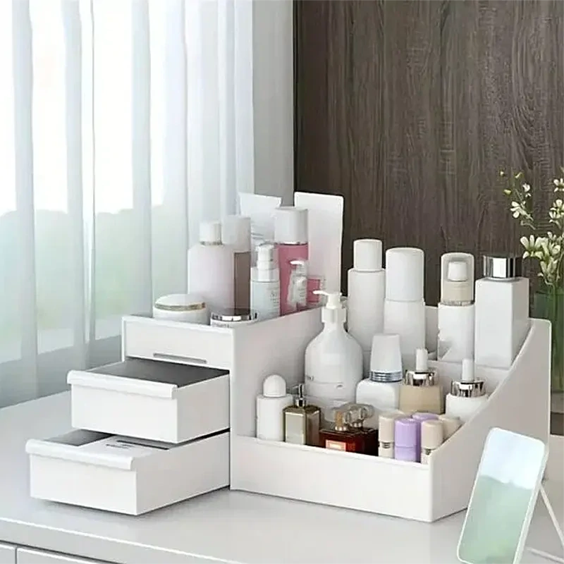 Tento organizér na kozmetiku a šperky pomáha udržať poriadok na toaletnom stolíku, v kúpeľni alebo na poličke. Vďaka kombinácii zásuviek a otvorených priehradiek umožňuje prehľadne uložiť kozmetiku, make-up, šperky alebo drobné doplnky.