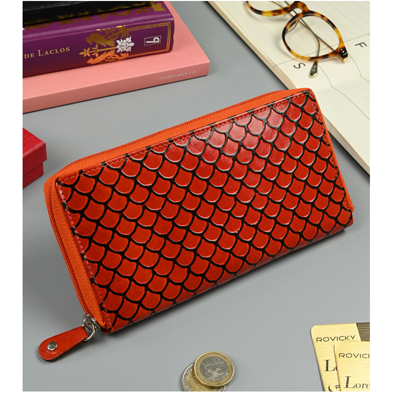 Dámsky kožená horizontálna peňaženka. Uzavreté na zips. Vyrobené z prírodnej kože. Koža je zdobená vzorom krokodílej kože. Vybavené pútkami na karty, vreckami na doklady a klasickými priehradkami na hotovosť.