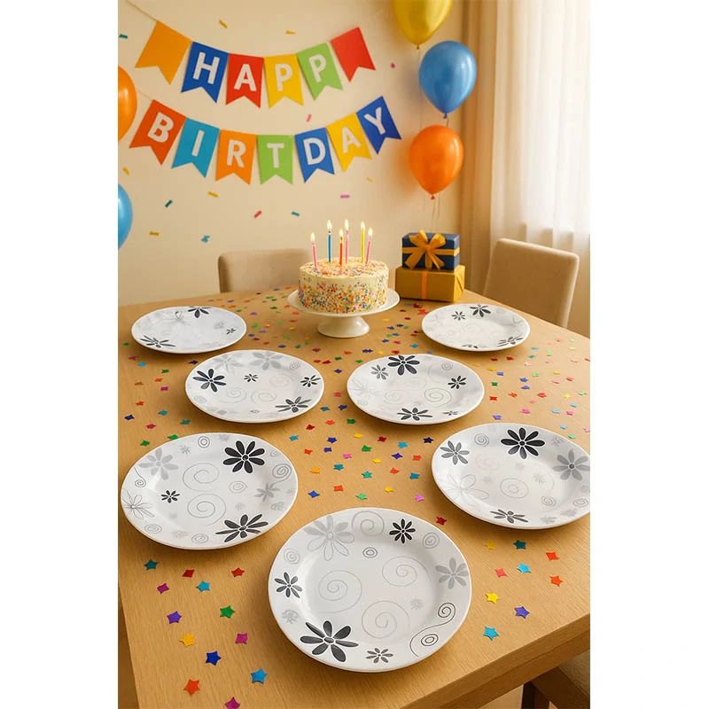 Hľadáte praktické a zároveň štýlové jednorazové taniere na oslavu? Táto sada 8 kusov plastových tanierov s jemným kvetinovým vzorom sa postará o dokonalú atmosféru narodeninovej, detskej či rodinnej párty.