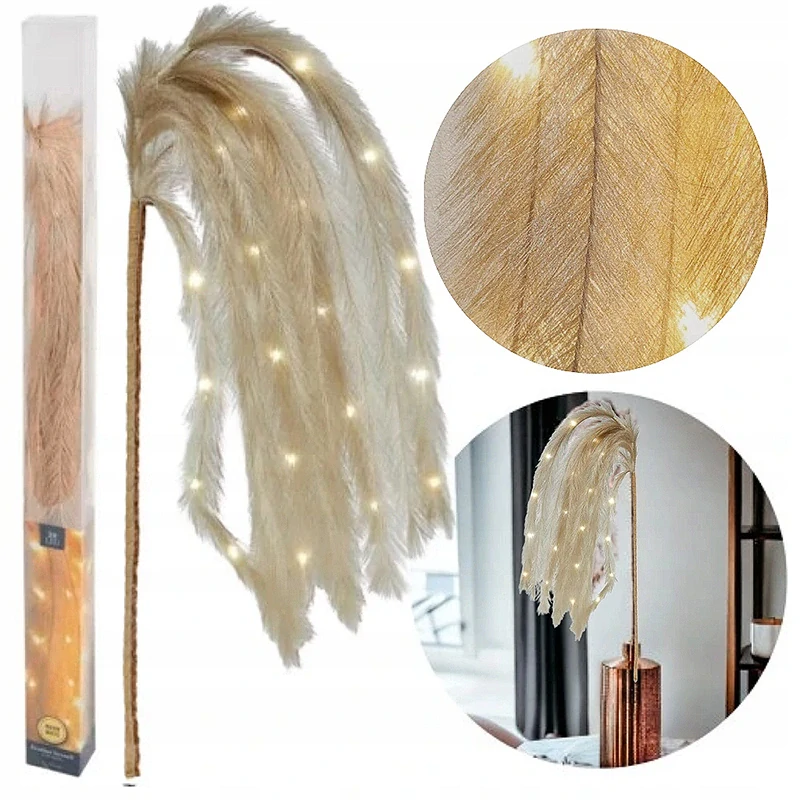 Mäkká tráva z pierok s osvetlením v podobe 20 LED diód, napájaná batériami, takže ju môžete umiestniť kamkoľvek. Zásobník batérie je zabalený v jutovom vrecku, ktoré farebne ladí s celokom Ideálny doplnok do interiérov v štýle Boho.