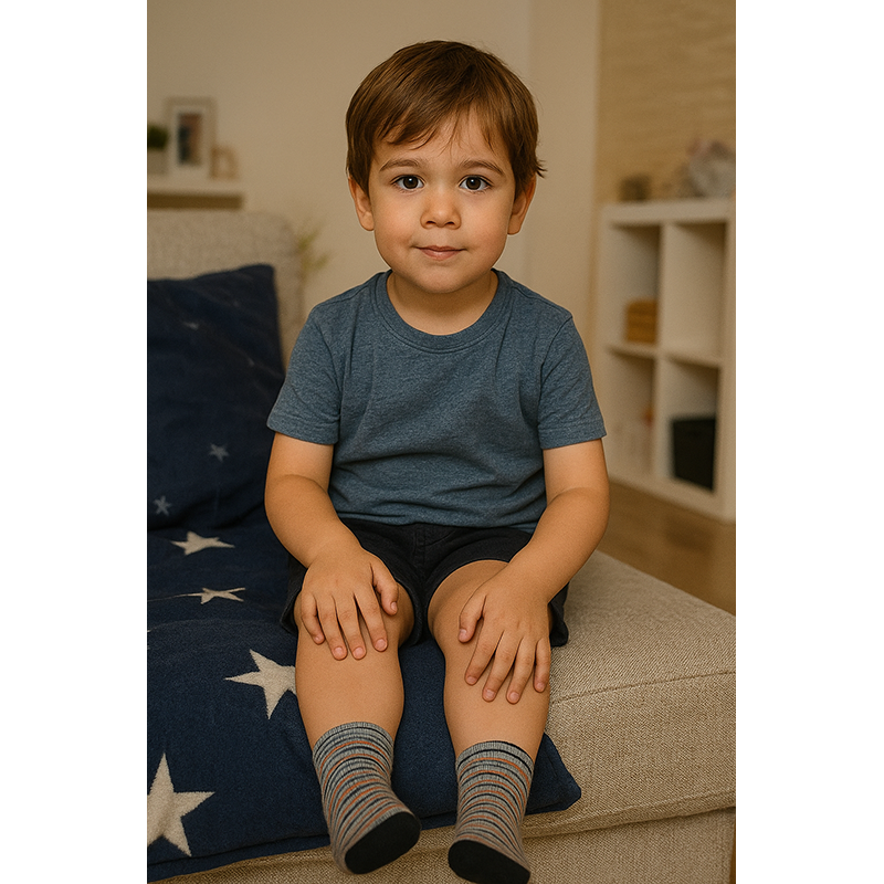 Detské bavlnené ponožky sú vyrobené z vysoko kvalitnej bavlnenej priadze. Sú veľmi príjemné na dotyk a pohodlné. Majú ploché švy s nesťahujúcim a protisklzovým lemom. Pevne držia a zároveň sa nezarezávajú do pokožky.