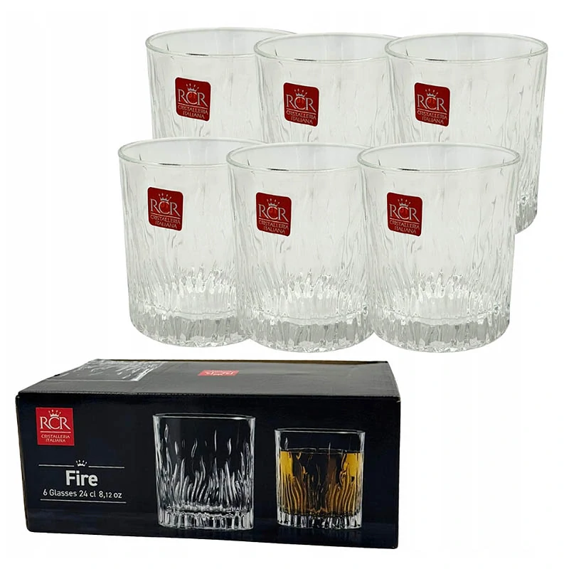 Sada 6 pohárov RCR Fire je určená pre milovníkov kvalitného servírovania. Tieto krištáľové poháre s objemom 24 cl sú vyrobené z inovatívneho materiálu Luxion®, ktorý predstavuje vrchol talianskej sklárskej technológie. Ich elegantný dizajn so štruktúrovaným dekorom pripomínajúcim plamene okamžite upúta pozornosť a pozdvihne každý spoločenský okamih – či už ide o podávanie whisky, nealkoholických nápojov alebo vody.