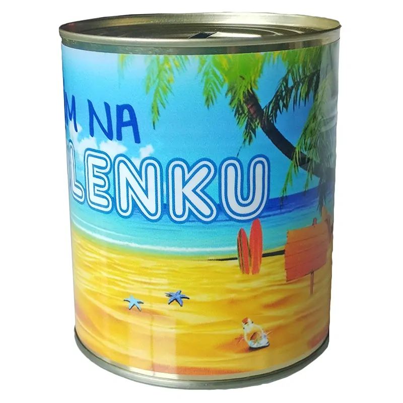 Pokladička vo frome plechovej konzervy Šetrím na dovolenku. Originálny pekný darček.