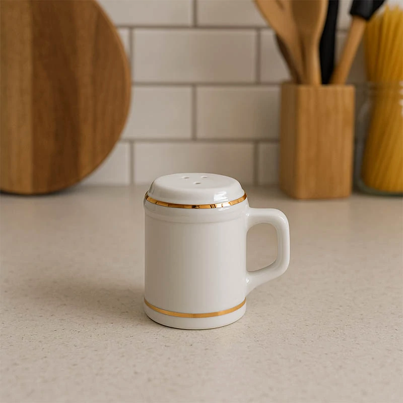 🧂 Elegantná porcelánová korenička v tvare krígľa, zdobená jemným zlatým lemovaním, je ideálnym doplnkom do štýlovej kuchyne alebo ako dekorácia do vitríny.