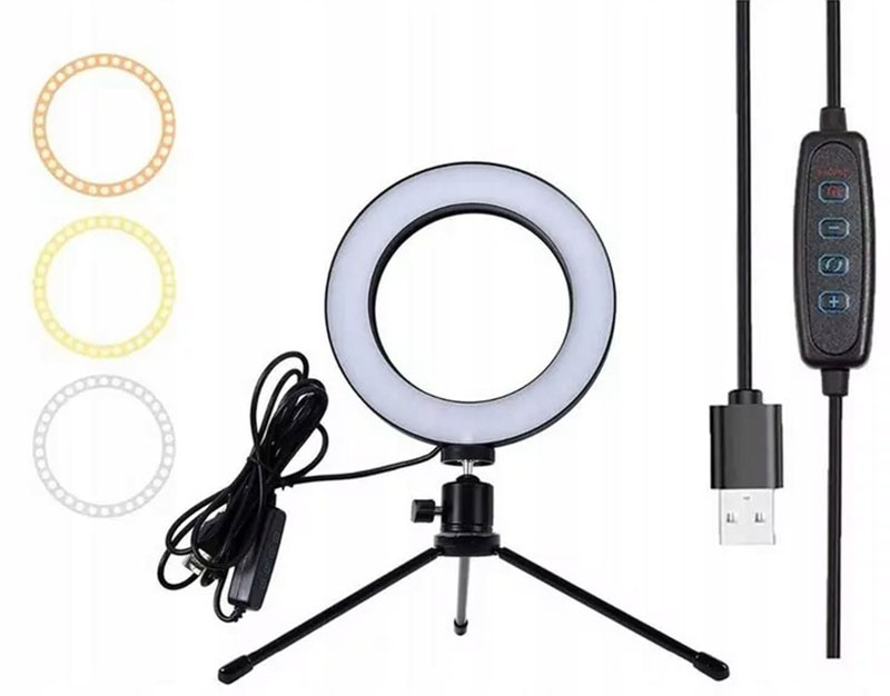 Dokonalá súprava osvetlenia pre každého nadšenca selfie! LED prestencová lampa s možnosťou zmeny bielej farby (studená / teplá / neutrálna). Kompletná so skladacím stojanom na statív.