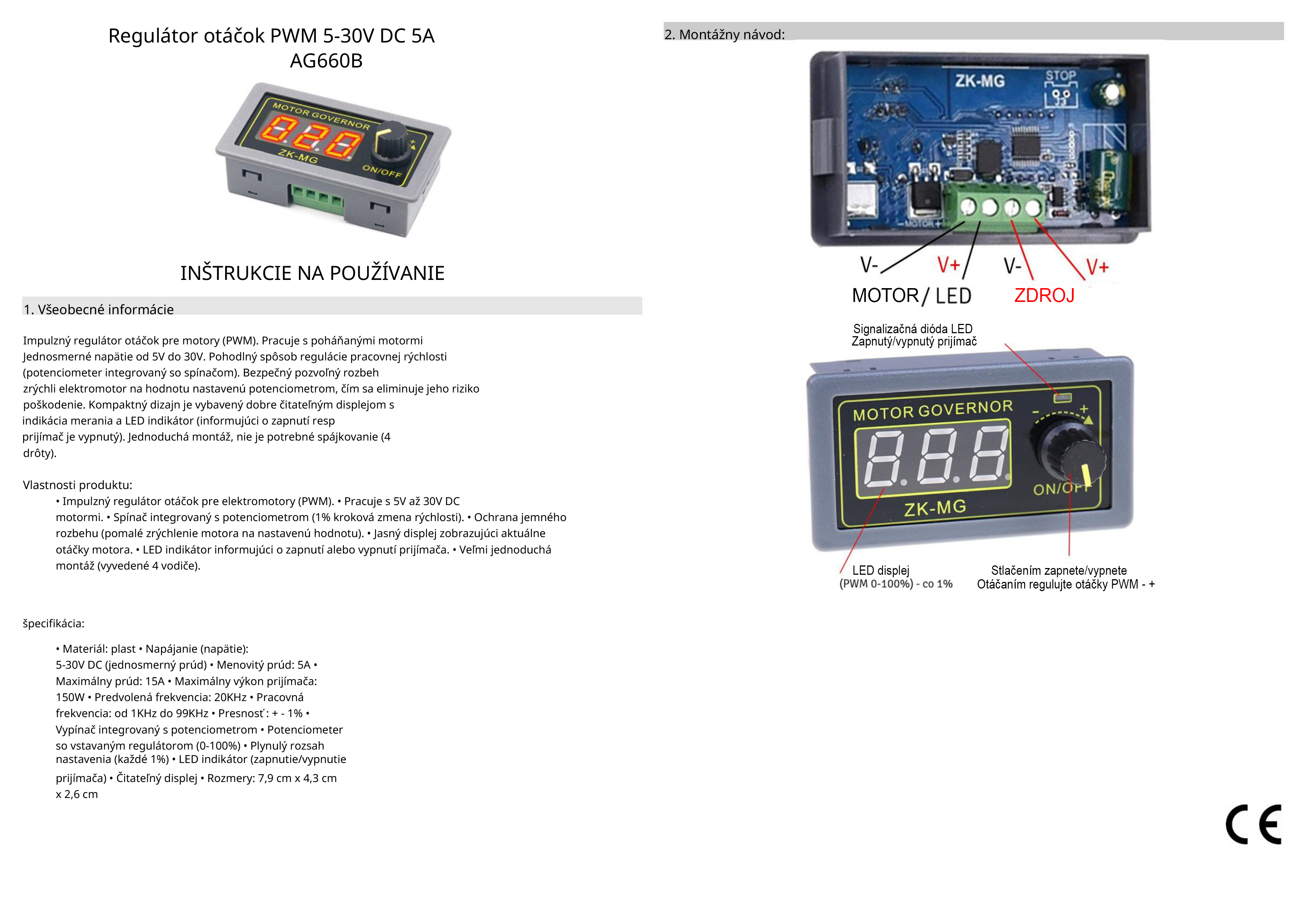 Impulzný regulátor otáčok pre motory (PWM). Pracuje s jednosmernými motormi s napätím od 5V do 30V. Pohodlný spôsob regulácie pracovnej rýchlosti (potenciometer integrovaný vo spínači). Bezpečný systém typu soft-start pomaly zrýchľuje elektromotor na hodnotu nastavenú potenciometrom, čím sa eliminuje riziko jeho poškodenia. Kompaktné prevedenie je vybavené čitateľným displejom s indikáciou merania a LED indikátorom (informuje o zapnutí alebo vypnutí prijímača). Jednoduchá montáž, ktorá nevyžaduje spájkovanie (vyvedené 4 vodiče).