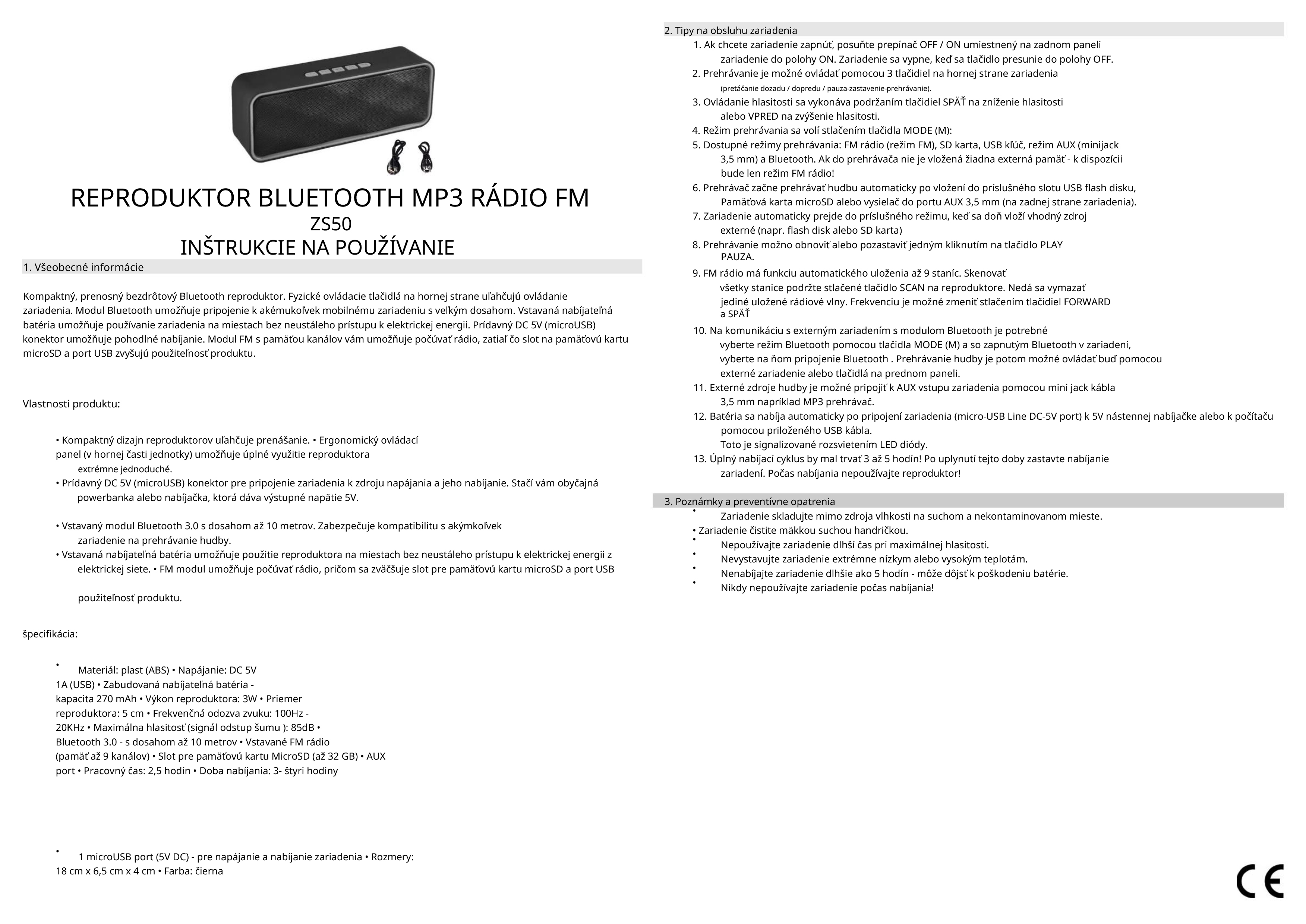 Kompaktný, prenosný bezdrôtový Bluetooth reproduktor. Fyzické ovládacie tlačidlá na hornej strane uľahčujú ovládanie zariadenia. Modul Bluetooth umožňuje pripojenie k akémukoľvek mobilnému zariadeniu s veľkým dosahom. Vstavaná nabíjateľná batéria umožňuje používanie zariadenia na miestach bez neustáleho prístupu k elektrickej energii. Prídavný DC 5V (microUSB) konektor umožňuje pohodlné nabíjanie. Modul FM s pamäťou kanálov vám umožňuje počúvať rádio, zatiaľ čo slot na pamäťovú kartu microSD a port USB zvyšujú použiteľnosť produktu.