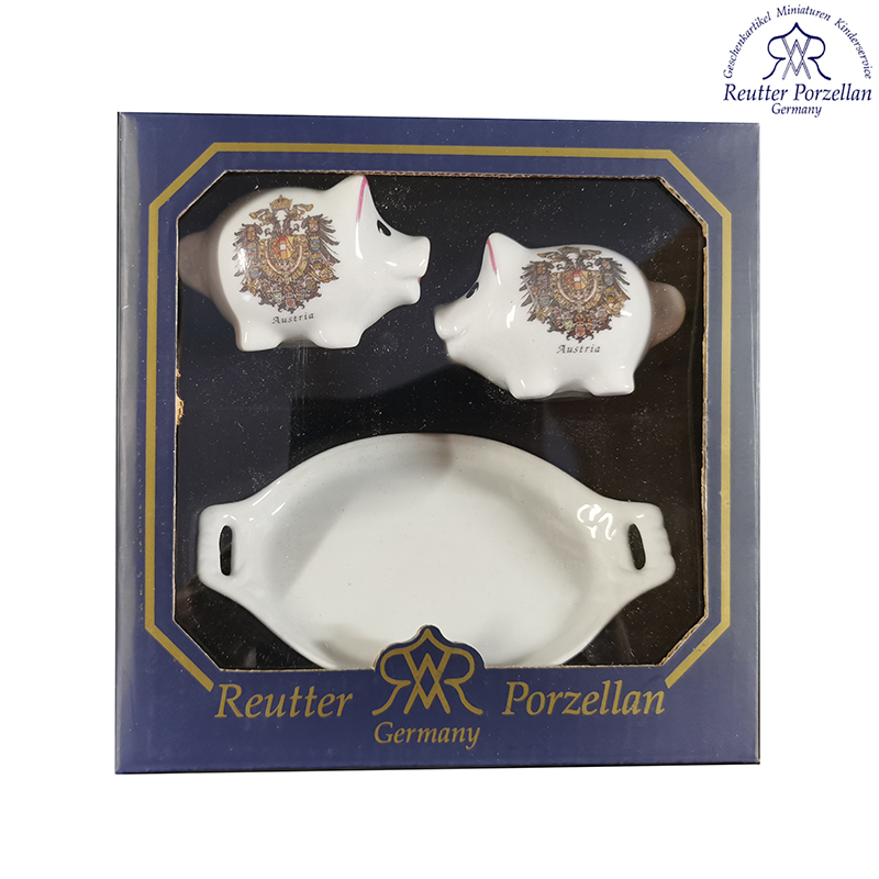 Porcelánové koreničky v tvare prasiatka s dekorovaním a nápisom Austria. Produkt vyrobený tradičnými metódami remeselníkmi v Reutter Porzellan. Koreničky sú vhodné aj ako dekorácia interiéru.