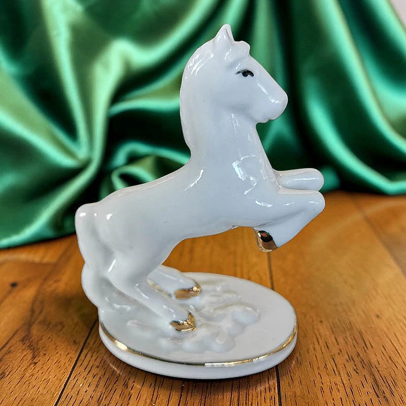 Soška je vyrobená z porcelánu v bielom prevedení a doplnená o jemné zlaté detaily na podstavci a kopytách. Takéto spracovanie pôsobí elegantne a zároveň decentne, vďaka čomu sa figurína hodí do rôznych typov interiérov. Môže byť umiestnená na poličke, komode, pracovnom stole alebo v dekoratívnej vitríne.