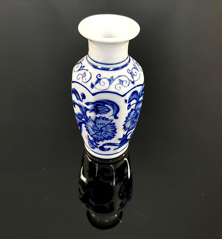 Porelánová váza zdobená modrými kvetmi.
