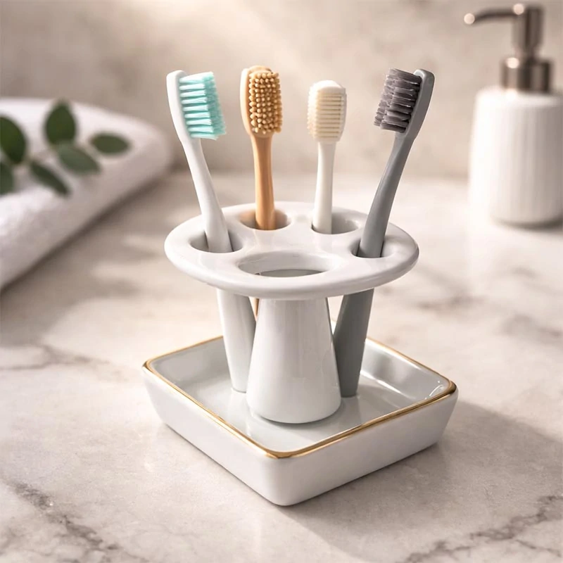 Tento stojan na zubné kefky predstavuje jednoduché a funkčné riešenie pre každodennú hygienu v domácnosti. Udržiava kefky oddelene, zachytáva prebytočnú vodu a pomáha udržať priestor okolo umývadla čistý a uprataný. Vďaka kompaktným rozmerom a nadčasovému vzhľadu je vhodný do rôznych typov kúpeľní a môže sa stať praktickým doplnkom, ktorý uľahčí každodennú starostlivosť o ústnu hygienu.