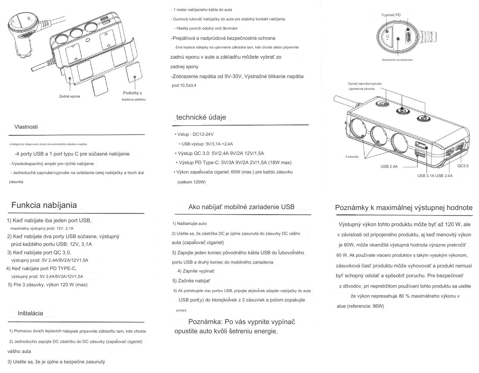 Rozbočovač zásuvky zapaľovača je ideálny pre každé auto. Disponuje 4 USB zásuvkami vrátane jednej typ-C 18W a 3 zásuvkami pre zapaľovač a vďaka malým rozmerom ho schováte na pre vás vhodnom mieste. Každá zásuvka zapaľovača cigariet má samostatný vypínač, ktorým možno vypnúť zásuvky, ktoré sa práve nepoužívajú.