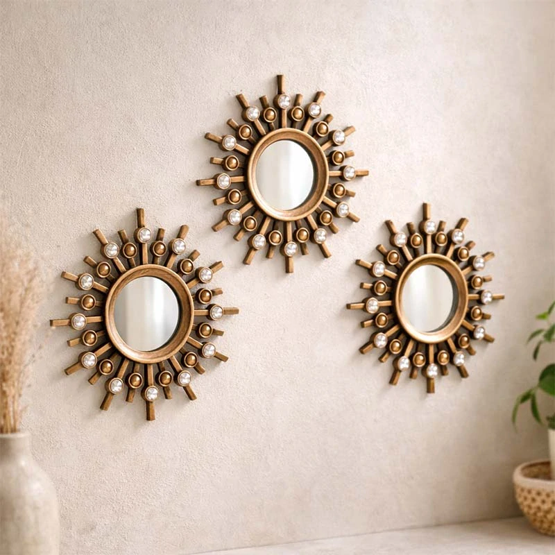Každé zrkadlo má originálny dekoratívny rám v tvare slnečného lúča, ktorý je doplnený drobnými kameňmi. Tento detail dodáva celku elegantný vzhľad a jemný lesk. Bronzový odtieň pôsobí teplo a prirodzene, takže sa dobre kombinuje s rôznymi typmi nábytku a interiérových doplnkov.