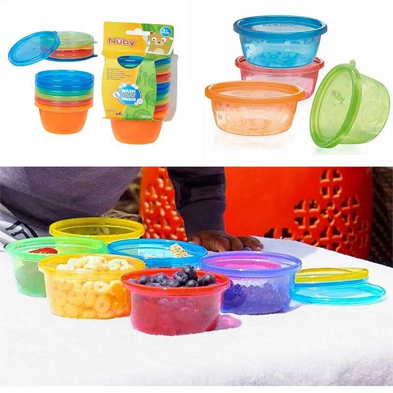 Praktická sada šiestich plastových misiek Nuby s objemom 120 ml a farebnými viečkami je ideálna na uskladnenie, mrazenie aj ohrievanie jedla pre deti. Misky sú vyrobené z pevného plastu, odolného voči poškodeniu. Vďaka viečkam je možné obsah bezpečne uzavrieť a uchovať čerstvý.