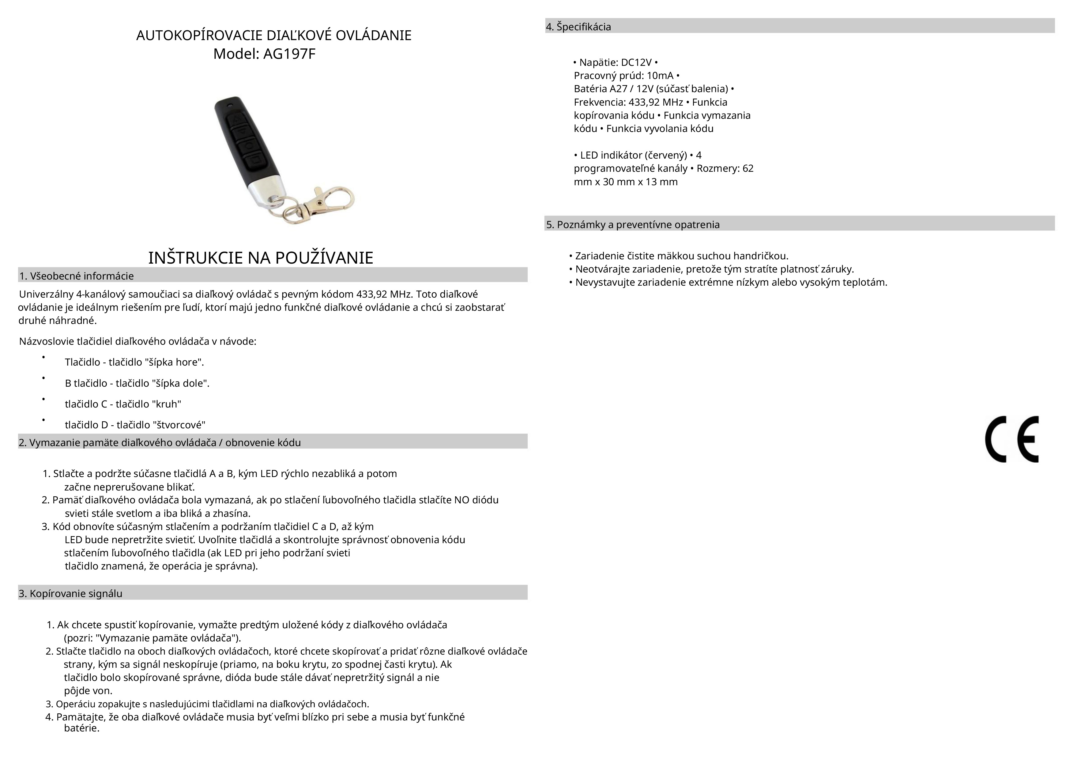 - Samokopírovacie diaľkové ovládanie 433,92 MHz s príveskom