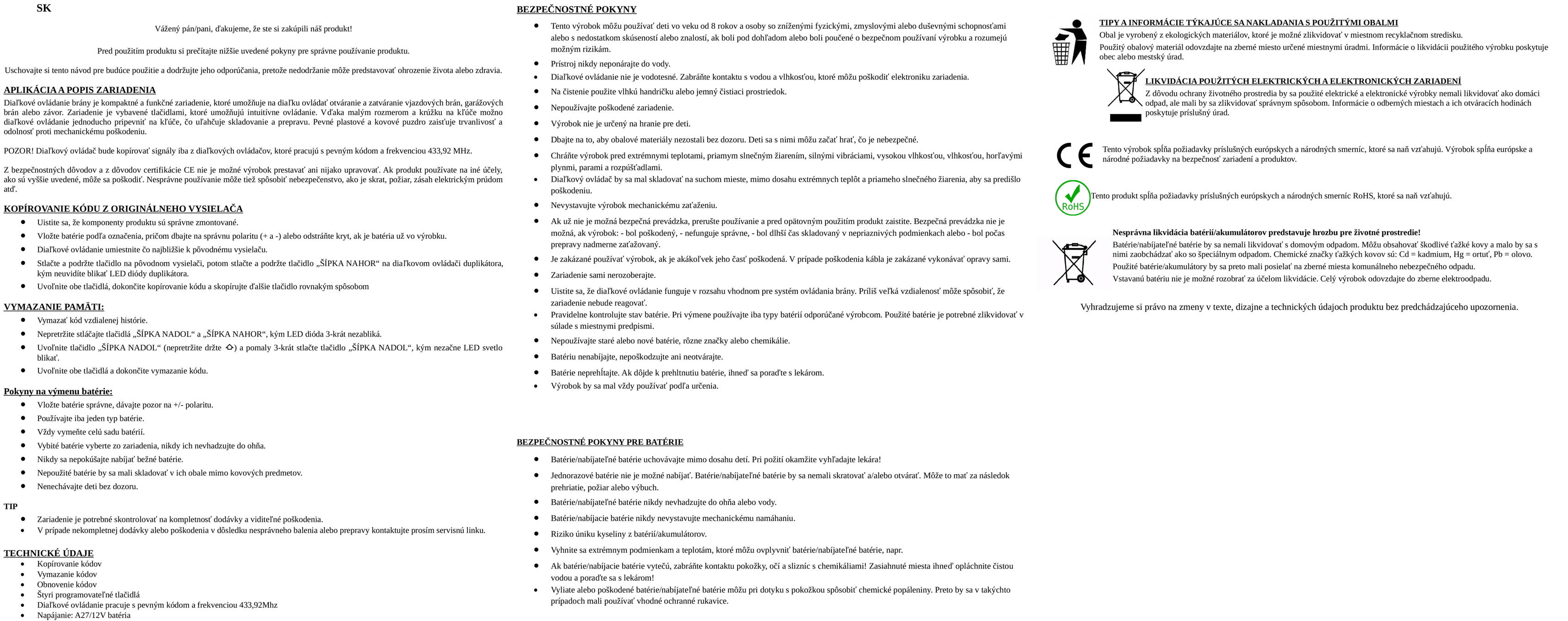 Tento samokopírovací diaľkový ovládač umožňuje skopírovanie kódu z existujúceho ovládača na ovládanie garážových brán, alarmov, automatických systémov a ďalších zariadení pracujúcich na frekvencii 433,92 MHz s pevným kódom.